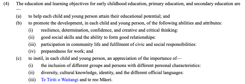 One might say that (b) and (c) are objectives the legislation has to ensure the education system develops things that are beyond knowledge and academic achievement, yet are just as important when it comes to developing as a person. So, we have a legislative basis for the claim that schools are results PLUS places. This is not just a hopeful claim made by those who put themselves in the progressive education pot, it is a legal requirement.