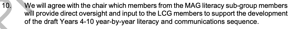 The Literacy Contributors Group (LGC) was one of two groups formed by the Ministry for the purposes of “developing principles and identifying pedagogical approaches” for the Common Practice Model that was to underpin the refreshed curriculum by incorporating “evidence-informed pedagogical approaches and practices that will better support all educators and address inequities in education”.