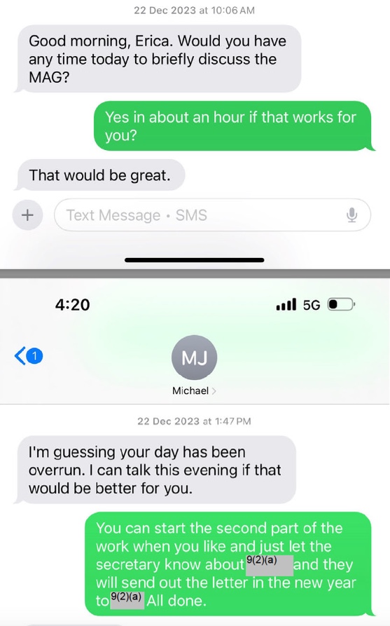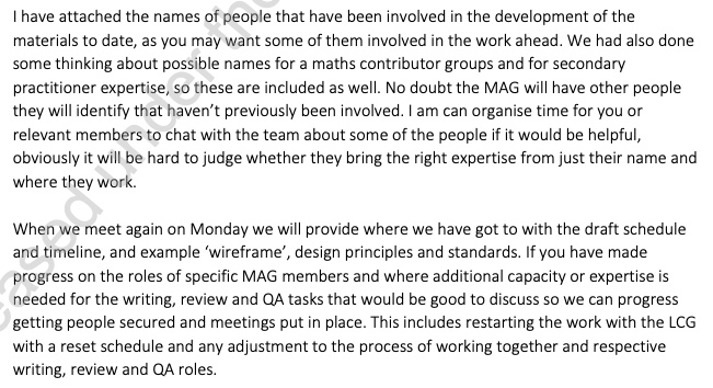 Stanford was aware that the MAG was operating beyond its terms and in violation of public service guidelines. A 15 March, 2024, briefing paper to her detailed the curriculum development the MAG was involved in, working with and directing the Literacy Contributors Group – this is before they submitted their report and well outside the bounds of permitted actions by an advisory group. It may even be possible Stanford gave the green light to them operating in this manner. In a text to Johnston on 22 December, 2023, three days after the official formation of the MAG, she says “You can start the second part of the work when you like”. When the only work for these kinds of groups is to advise, what is the “second part” she has authorised?
