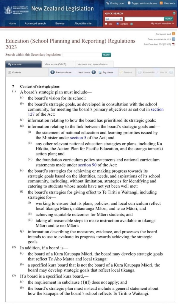 The removal of Te Tiriti o Waitangi from Section 127 of the Education and Training Act also spills over into strategic plans. For the uninitiated, school strategic plans are how a school board translates the high level legislative direction to boards found in Section 127 into something that is meaningful for their community. This localising of the Act is desirable. It is how boards answer the How are WE going to make this real HERE, for OUR kids? question.